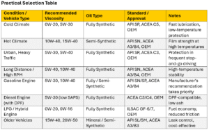This table summarizes which oil should be preferred under different conditions. However, you should always prioritize the viscosity and standards specified in your vehicle’s owner’s manual.