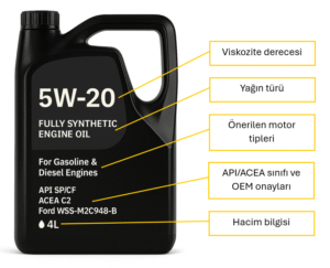 Motor yağı kutularının üzerindeki etiketler, yağın teknik özellikleri ve uygunluğu hakkında önemli bilgiler içerir. Etiketi doğru okumak, doğru yağı seçmenin anahtarıdır.