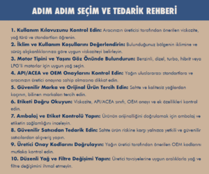 Aracınız için yağ temin ederken mutlaka ambalaj ve etiket kontrolü yapmaya önem vermelisiniz. Ayrıca, sahte ürün riskine karşı yalnızca güvenilir satıcıları tercih etmeli ve üretici tarafından önerilen viskozite ve OEM onay kodlarına dikkat etmelisiniz.