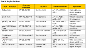 Bu tablo, farklı koşullarda hangi yağın tercih edilmesi gerektiğini özetliyor. Ancak, her zaman aracınızın kullanım kılavuzunda belirtilen viskozite ve standartlara öncelik verilmelisiniz.