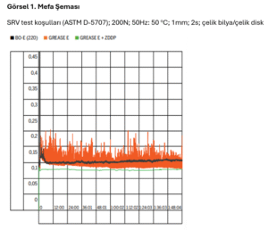 Bu da sentetik baz yağ kullanıldığında gereken kalınlaştırıcı miktarının neredeyse üçte birine düşürülebileceği anlamına geliyor. Tribolojik testler, en yüksek çözücülük gücüne sahip baz yağın, SVR (Schwingung Reibung Verschleiß) test cihazıyla ölçülen en düşük sürtünme katsayısını verdiğini gösterdi. Bu sonuç, daha önceki bir çalışmanın bulgularını da destekliyor. Naftenik yağ, uygulanan basınç altında daha hızlı sıkışarak daha yüksek bir basınç viskozite katsayısı ortaya çıkarıyor.